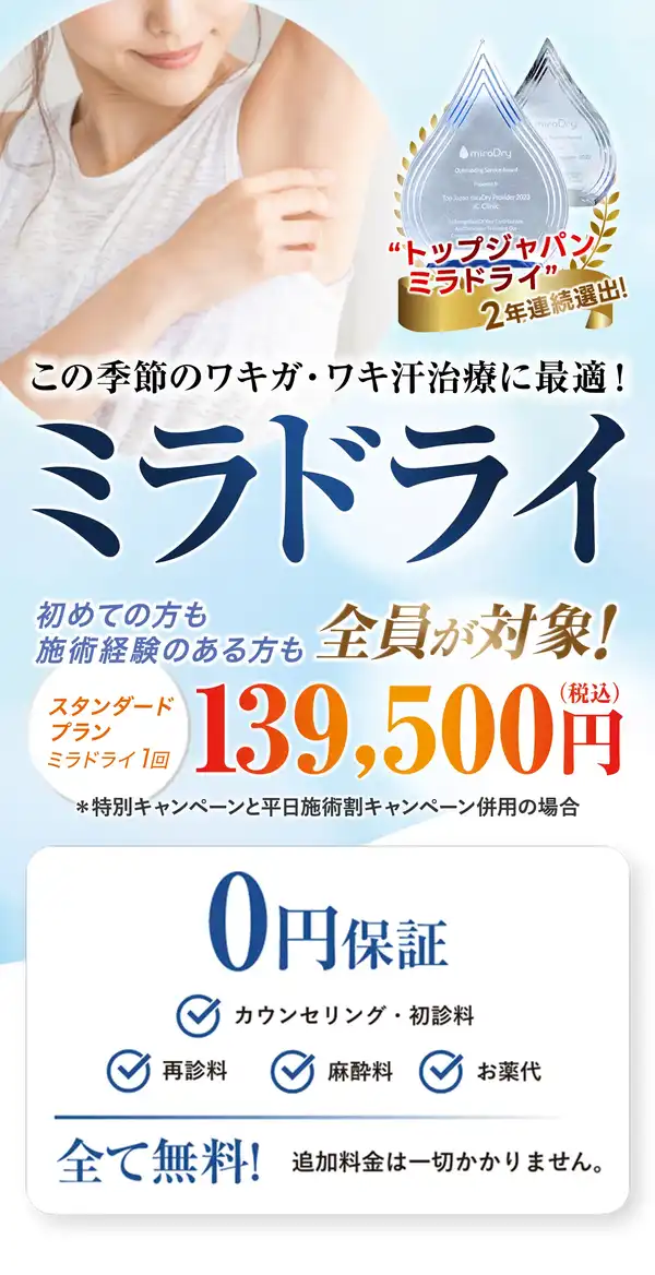 ミラドライの施術予約をお取り頂いた後にキャンセルを希望される場合、施術予約金として頂戴していた20,000円をキャンセル料としてお支払いいただきますので、ご了承ください。